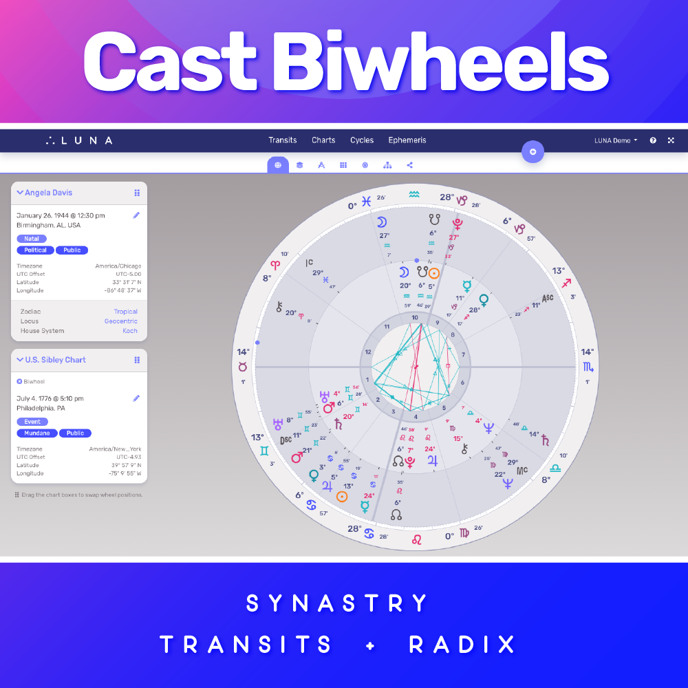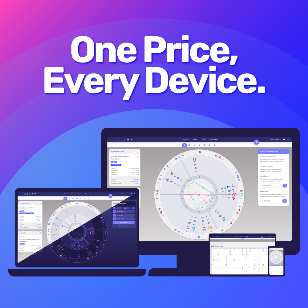 LUNA® is my go-to astrology tool because it’s visually appealing, easy to read, and web-based, allowing me to access it from all my devices. I love how quickly I can move forward or backward with transits and isolate specific aspects in a chart, making it simple for my clients to see what I’m referring to. It’s also affordable and easy to use, with flexible monthly or annual payment options.